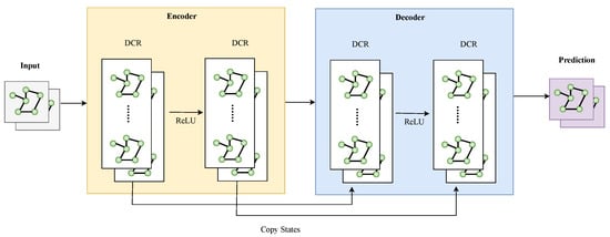 3. Diffusion Convolutional Recurrent Neural Networks are powerful graph-oriented deep learning models [40] which incorporate both spatial and temporal dependency in the traffic flow. Specifically, a DCRNN captures spatial dependencies using bidirectional random walks on the graph and captures temporal dependencies through an encoder–decoder architecture with scheduled sampling. Figure 4 presents the diagram of the DCRNN employed in this study, which ingests the passenger flow vectors for all stations, passes them on via an encoder–decoder based on Diffusion Convolutional Recurrent (DCR) layers and ReLU functions, and finally predicts the output.