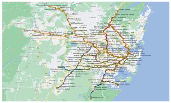 The original railway network, timetable, and real-time train movement data presented in this study are openly available from the NSW Transport Open Data Hub (https://opendata.transport.nsw.gov.au/), accessed on 1 February 2025. The mobile data were obtained from DSpark Australia.