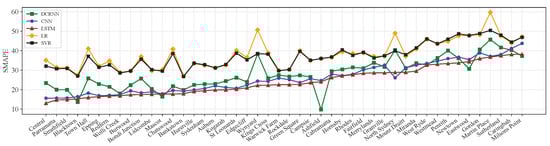 Scenario 1—Pre-COVID-19: This scenario used two months of mobility dataset from June to July 2019 with a one-hour frequency. The dataset was divided into two subsets for use in training and testing. The training dataset covered June 2019, while the testing dataset covered July 2019. Figure 8 showcases the SMAPE results across all models (DCRNN, CNN, LSTM, LR, and SVR) in ascending order for a selection of major stations in the network. It can be observed that the deep learning algorithms achieve better performance than LR and SVR, almost halving the SMAPE error to about for Central Station. For this reason, the performance metrics of both LR and SVR are excluded from the following results due to their low accuracy. Overall, LSTM outperforms even the other DL models; DCRNN significantly outperforms LSTM, but only for a limited subset of station (for instance, Ashfield reaches a very low SMAPE of , while Blacktown and Mascot have SMAPE scores between 14–15%).