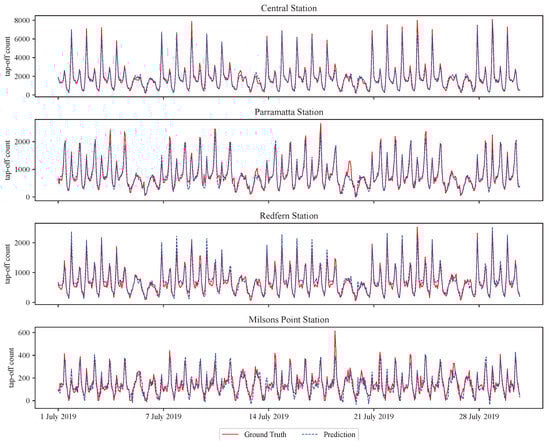 Predicted numbers of passengers in selected major stations using the LSTM algorithm in comparison to ground truth.