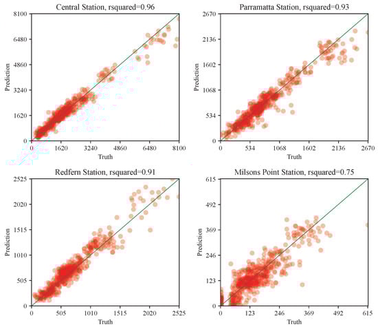 By analyzing the LSTM performance more closely, Figure 9 shows the passenger flow prediction and ground truth for four selected major stations. It can be seen that the predictions follow the real data trends very closely, with minor deviations during night time when passenger flows are usually lower in the CBD area. Similarly, Figure 10 shows the results (majority above ) to further identify the number of non-performing data points that might affect the results. Of these datapoints, a handful are either over- or under-predicted, while the majority are predicted along the regression line.