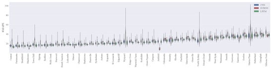 To further evaluate the robustness of CNN, LSTM and DCRNN, we trained 300 models for each type. their SMAPE values are illustrated in Figure 11 by violin plots. A violin plot is a hybrid of a box plot and a kernel density plot, which helps to visualize the distribution of numerical data. The results again indicate that the LSTM is more robust, achieving tighter SMAPE distribution plots (majority below ), while the DCRNN has the largest deviation in its distribution violins, indicating lower overall performance in comparison to the CNN and LSTM along with higher fluctuation from one run to another. For this reason, the results for the subsequent Scenario 2 focus on the better-performing CNN and LSTM models.
