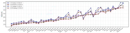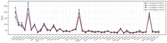 Scenario 2—Passenger Prediction During COVID-19: The COVID-19 pandemic saw a significant drop in the number of passengers across the Sydney public transport network, mainly due to travel restrictions and restricted seated capacity. Consequently, this scenario requires higher robustness from the prediction models in order to handle the challenge of data sparsity. We further trained and tested our best-performing DL models (CNN and LSTM) and evaluated their performance using the new incoming datasets from June to July 2020. Figure 12 showcases the SMAPE results for the CNN and LSTM models across the two training datasets. Overall, the models perform well, with SMAPE errors below for the ten most important stations during the COVID-19 pandemic. Figure 13 and Figure 14 respectively showcase the RMSE and MAE results for both the CNN and LSTM across the two training datasets. To summarize, while slightly better performance is recorded for the period prior to the COVID-19 pandemic when travel patterns were more stable, the DL models still provide good accuracy during the COVID-19 pandemic period, demonstrating that the proposed architecture remains viable under differing circumstances.