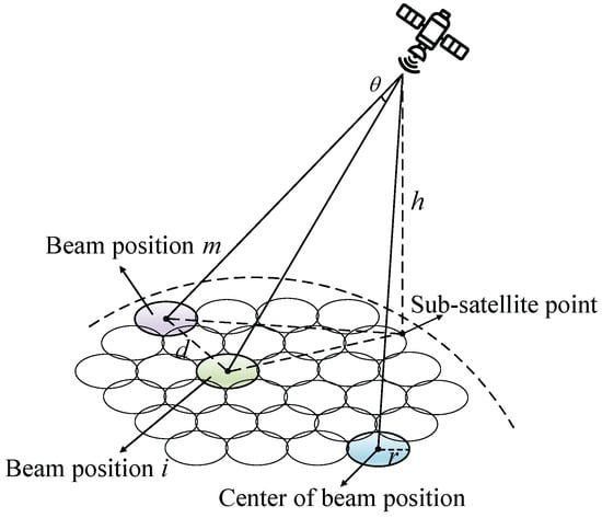 The inter-beam interference value mainly depends on the angle between the satellite’s aiming lines to the centers of beam positions m and i.The cause of co-channel interference is the radiation from the antenna side-lobes interfering with co-channel beam positions. The co-channel interference model for LEO satellites is shown in Figure 2. Service beams illuminate beam position m and beam position i at the same time. The geometric angle formed by the satellite’s center to beam position m and its center to beam position i is denoted by . In this scenario, assuming that beam position m is the interfered area, we discuss the co-channel interference that beam position i causes for beam position m. The interference between beam positions in the downlink can be denoted by