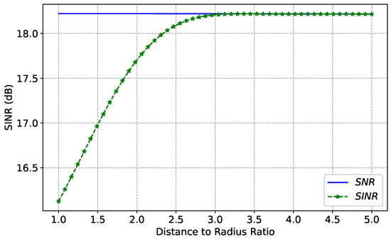 where is the transmit power of the satellite beam for beam position m. represents the channel coefficient of service beam k illuminating beam position m. represents the total on-board bandwidth. represents the noise power spectral density. is the co-channel interference that co-channel beam position i causes to beam position m. Taking the distance d between the centers of beam position m and beam position i as a variable, the SINR of beam position m is obtained as shown in Figure 3.