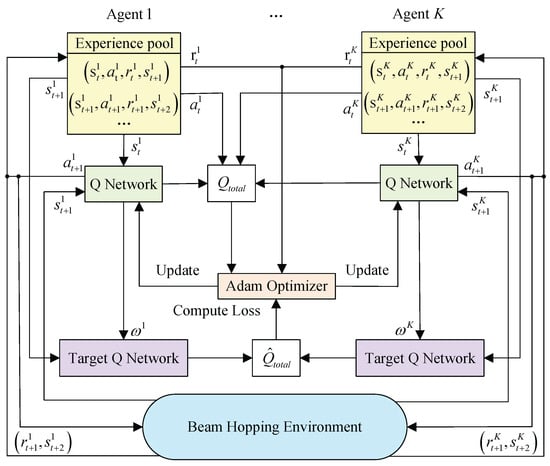 - Wen, J.; Wang, C.; Zhao, X.; Chen, R.; Wang, W. Beam Hopping and Power Allocation of LEO Multi-Satellite Communication Network Based on Multi-Agent DQN Algorithm. In Proceedings of the 2024 10th International Conference on Computer and Communications (ICCC), Chengdu, China, 13–16 December 2024; IEEE: Piscataway, NJ, USA, 2024; pp. 1832–1839. [Google Scholar]
