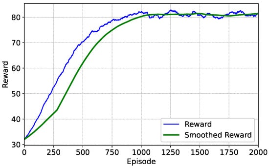 The episode rewards of the MARL-VDN algorithm applied in this paper during offline training in a dynamic environment are shown in Figure 5, where the weight coefficient equals 0.5. The weight coefficient is used to balance delay fairness and user satisfaction. The larger is, the more the system emphasizes delay fairness. Conversely, the smaller is, the more the system emphasizes user satisfaction. In this paper, when equals 0.5, multi-agents can better balance the two optimization objectives of delay fairness and user satisfaction. As can be clearly observed from the figure, during the 2000-episode training process, the reward curve gradually rises and eventually converges, which indicates that agents can cooperate with each other during the training process. In addition, the reward curve in the figure not only has fast convergence but also long-term stability, enabling this algorithm framework to adapt to complex and variable traffic demands with ease.