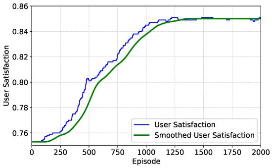 Figure 7 shows the episode user satisfaction during the training of the algorithm in a dynamic environment. We can see that during the 2000-episode training process, the user satisfaction gradually increases and stabilizes, and the final satisfaction level remains at 85%. The simulation result indicates that the MARL-VDN algorithm can maintain a high level of resource utilization efficiency in the face of dynamic traffic changes, which strongly verifies the effectiveness of the multi-agent cooperation framework. The gentle characteristic of the latter part of the curve in the figure reflects that the system has strong anti-interference ability and is very suitable for dynamic satellite communication scenarios. In scenarios where ground users are unevenly distributed and demands are time-varying, the algorithm applied in this paper can dynamically adjust the beam resource allocation to effectively guarantee quality of service to most users. Furthermore, the sustained high user satisfaction observed even after 2000 episodes demonstrates the system’s capacity for continuous optimization, effectively adapting to long-term variations in traffic demands.