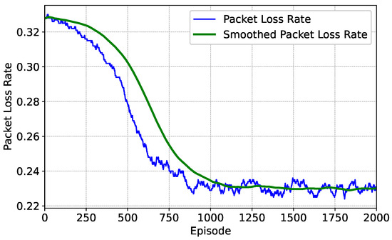 After training, user satisfaction can be stably maintained at a relatively high level, which reflects the good adaptation relationship between the throughput and the total traffic demand of the algorithm applied in this paper during long-term operation. When the throughput allocated by the system can meet the high traffic demand in the scenario, the situation of data packet loss will also improve. Figure 8 presents the change of the business data packet loss rate during the training process of the algorithm. It can be clearly observed that during the 2000-episode training process, the business data packet loss rate gradually decreases and tends to be stable. Eventually, the business data packet loss rate stably remains at about 23%. The result demonstrates that as training progresses, the algorithm can continuously optimize the resource allocation strategy, effectively reduce the business data packet loss rate, improve the stability and reliability of the system in handling traffic demands, and thus guarantee user satisfaction and system performance.