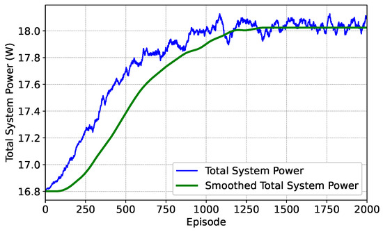 Figure 9 shows the convergence process of the total system power consumption during the training of the algorithm, where the total power consumption refers to the average value of the sum of the power consumption of all service beams used for data transmission. It can be seen from the figure that the total system power consumption eventually converges to around 18 W. In terms of principle, according to the Shannon formula, under the conditions of effectively avoiding interference and given noise, the downlink throughput of beam-positioned users has a logarithmic functional relationship with the transmit power. When the throughput allocated by the system can meet the relatively high traffic demands within the scenario, the power demand per time slot will also be optimized accordingly. Since the number of beam hopping time slots set in this paper is sufficient, business data can be dispersed for transmission in more time slots. The above method of transmission greatly reduces the power demand per time slot, thereby giving the algorithm significant advantages in energy-saving performance. During the training process, compared with the initial stage, the total system power consumption tends to be stable in the second half, and the energy-saving effect of the algorithm remains consistently good, which fully demonstrates that the algorithm framework can withstand environmental changes and achieve efficient energy saving while ensuring service performance. Throughout the iterative process, the algorithm always tends to maintain a relatively low power consumption level, showing good energy-saving characteristics.