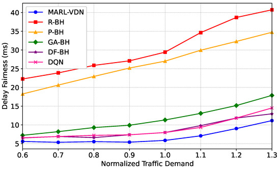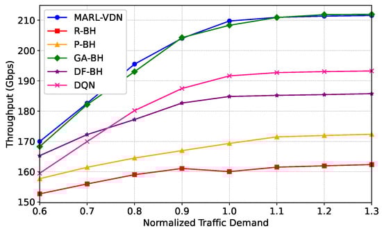 To verify the long-term throughput performance of the algorithm in the multi-agent system applied in this paper, we tested scenarios with 100 time slots and different traffic demands. Figure 10 shows the relationship between the long-term throughput performance under different methods and different traffic demands. From the figure, we can observe that the performance of the algorithm in this paper outperforms other algorithms. Compared with the RBH, PBH, DF-BH and DQN, the long-term throughput of the algorithm in this paper increases by 30.3%, 22.7%, 13.9%, and 9.5%, respectively. The GA-BH also seeks the optimal solution in the entire action space, so its throughput performance is superior compared to other algorithms. However, due to its high computational complexity, the algorithm in this paper still has an advantage. When the system-provided capacity fails to meet traffic demands, specifically in scenarios where the normalized traffic volume exceeds 100%, the system throughput growth of other algorithms tends to stabilize. Under such conditions, the performance of the MARL-VDN algorithm in terms of system throughput is still significantly better than that of other algorithms.