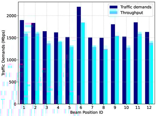 The values of the relevant simulation parameters are summarized in Table 3. The LEO beam hopping satellite communication system proposed in this paper operates in the Ka-band with a carrier frequency of 20 GHz. The satellite orbit altitude is assumed to be 550 km. A single satellite is equipped with four service beams, and the satellite-covered ground area is divided into 12 positions. The total system bandwidth is 200 MHz. Each beam has five power options, and the maximum beam power is 8 dBW. The satellite transmission gain is 25 dBi, and the ground reception gain is 45 dBi. Each time slot is set to be 2 ms long, and the maximum residence time of a data packet is 70 ms. Before entering the training period, the arrival of data packets at each position follows a Poisson distribution. During the training period, the traffic demands for each beam position range from 1500 to 2200 Mbps. To reflect the time-varying characteristics of traffic demand, the traffic volume requested by each beam position in each time slot is generated based on its remaining data volume.