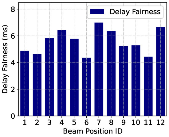To validate the long-term delay fairness performance of the algorithm, we tested scenarios with different traffic demands in 100 time slots. The traffic demands of each beam position range from 1500 to 2200 Mbps. still equals 0.5. Figure 6 shows the convergence of the average delay of data packets waiting as well as transmission during the training process of the algorithm. We can observe that during the 2000-episode training process, the delay fairness first decreases and then converges to a stable state. Eventually, the delay fairness converges to about 5.2 ms. This result proves that after sufficient training, the algorithm can effectively reduce the average delay of data packets at each beam position in scenarios with different traffic demands; it can achieve good delay fairness, adapt to long-term traffic changes, and has the ability to guarantee long-term delay fairness performance in the multi-agent system.