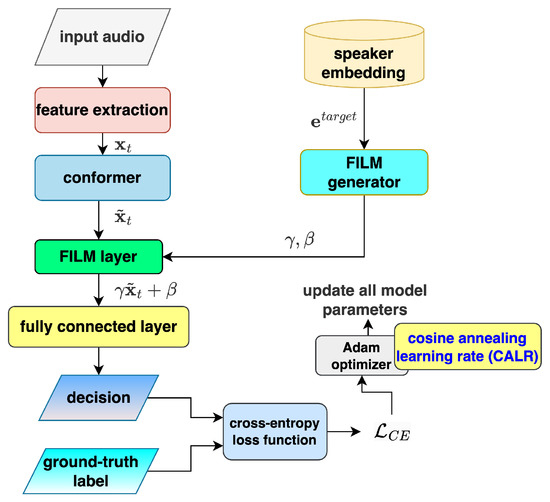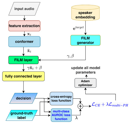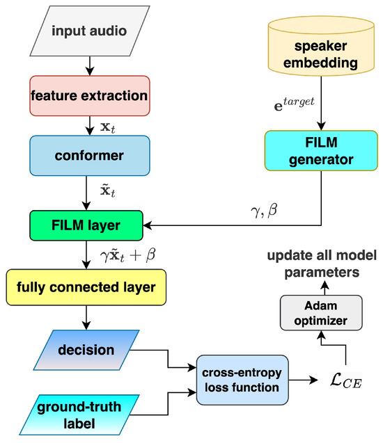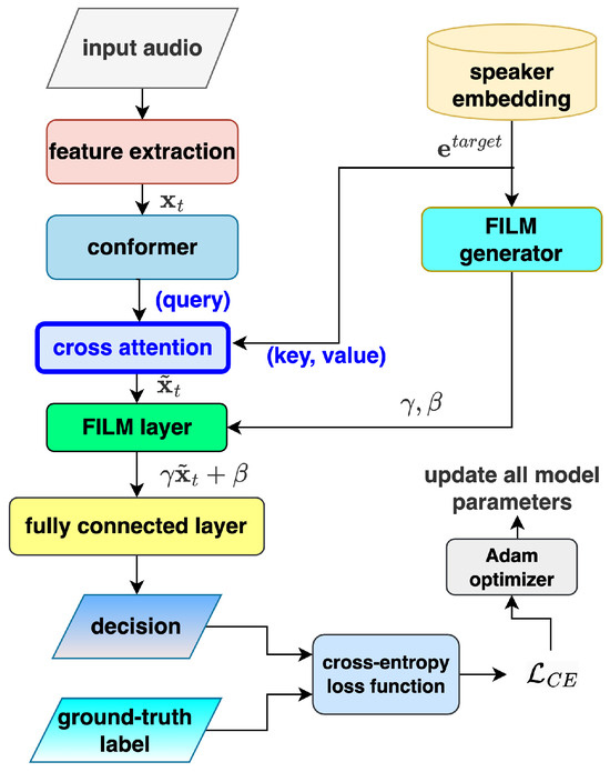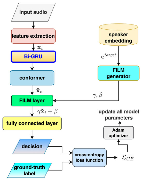 where is a weight factor. This hybrid loss strategy enhances the PVAD model’s performance by jointly optimizing individual prediction accuracy and class discriminability, particularly in imbalanced settings with sparse target speech. The flowchart of the revised PVAD framework that uses this hybrid loss is shown in Figure 4.