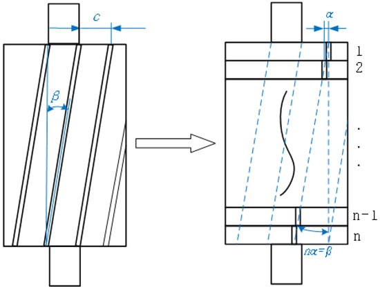 The skew factor is calculated from the skew angle β where α is the small angular difference between neighboring guide bars and c is the spacing between two neighboring guide bars. The physical model shown in Figure 1 can be regarded as an infinite series of infinitesimal segments (n→∞), with each segment angular displacement being dθ and satisfying β = ∫dθ. In the discrete model, if the number of segments is n, the angle of each segment α = β/n, which strictly satisfies nα = β when n→∞, where β is the entire conductor skew section of the radian, i.e., skewness.
