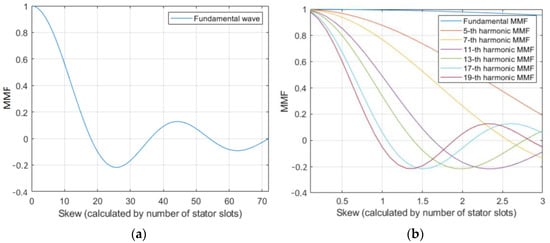 Therefore, to eliminate the vth harmonic, it is only necessary to make the skew factor of this harmonic equal to zero, but since harmonics of different orders exist simultaneously, it is necessary to consider them in a comprehensive way and to adopt an appropriate skew distance for processing. Based on the skew coefficients of the fundamental and harmonics, the relationship between the skew distance and the magnetomotive force (MMF) coefficients of each order is shown in Figure 2.