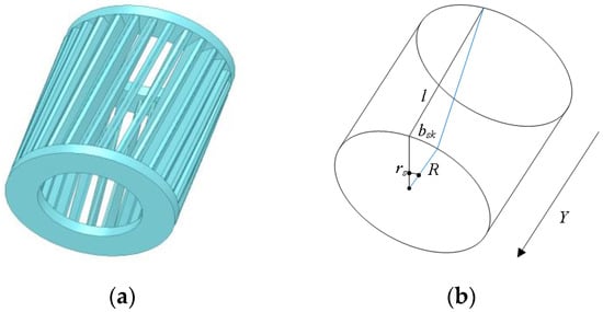 A single-slewed rotor refers to a rotor conductor that is offset by a certain angle in the axial direction, which causes both the fundamental and harmonics of the stator to be weakened. In order to calculate the weakening effect, a skewed coefficient needs to be added in addition to the potential distribution coefficient and pitch coefficient. Figure 1 shows a simplified schematic diagram of a single skewed rotor. In the rotor structure of induction motors, the role of the end rings is more significant during motor starting or speed change. The theoretical model of this study focuses on the analysis of electromagnetic vibration under steady state operation (slip rate s < 2%), where the rotor current frequency is very low, the resistance of the end rings dominates the impedance characteristics, and the regulation of the magnetic field distribution in the air gap is negligible. Thus the end ring portion of an ordinary aluminum rotor is omitted from the figure.