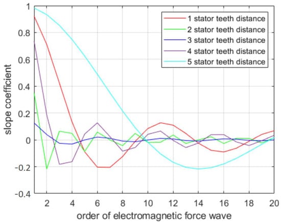 Figure 6 shows the variation of the slope coefficient for a 36–28 motor rotor with skew slot spacing from 1–5 stator teeth distance. The slope coefficient directly reflects the change in amplitude of the electromagnetic excitation force, and from this coefficient, it can be seen that when the rotor is tilted at a certain angle, the higher-order electromagnetic forces are slightly weakened. At the same time, when the tilt angle is greater than one stator tooth, only specific electromagnetic forces higher than a certain order are weakened to within 15%. When the pitch angle is three stator teeth apart, it is optimal, with each order of force being weakened by an average of approximately 5%.