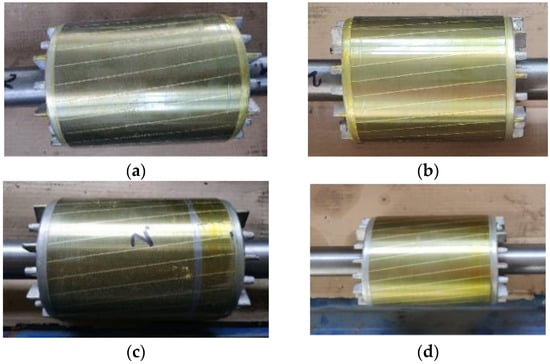 Physical diagram of a rotor with various skew parameters: (a) skewed 10°; (b) skewed 12.8°; (c) skewed 14°; (d) skewed 20°.