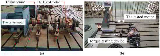 As the skewed rotor reduces the torque performance of the induction motor, the torque performance of the skewed rotor was tested with different parameters. The maximum torque and the locked rotor torque of the motor for different rotors were tested. The test equipment is shown in Figure 8.