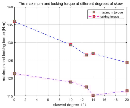 Vibration tests were performed for rotors with skew angles of 0°, 10°, 12.8°, 14°, and 20°. The rotor with 0° skew is a straight skewed rotor and is given in the literature []. Figure 7 shows the plots for rotors with other parameters.