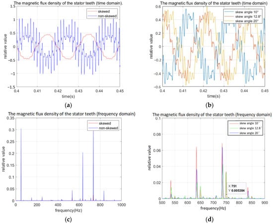 Comparison of the magnetic density of the air gap at different skew distances: (a) straight and 10° skew states in the time domain; (b) different skew degrees in the time domain; (c) straight and skewed condition under frequency domain; (d) differently skewed under frequency domain.