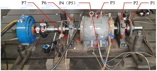 In the diagram, X, Y, and Z represent the axial, circumferential radial, and tangential directions of the motor, respectively. Vibration acceleration sensors are installed at points P1 to P7, which are located at the bottom of the non-shaft end cover, the top of the non-shaft end cover, the top of the stator, the stator foot (front and back), the base plate, the top of the shaft end cover, and the bottom of the shaft end cover, in order.