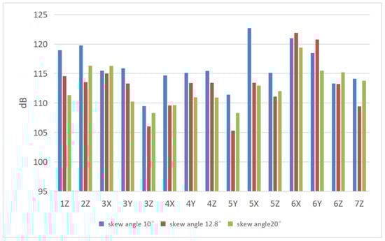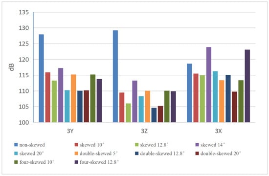 Taking the test results of three different rotors with different inclined slots together, we can observe the overall electromagnetic vibration amplitude and the trend of the different measurement points in three directions. Meanwhile, as can be seen from the amplitude comparison in Figure 12, the overall amplitude of the casing decreases significantly when the rotor is tilted. The damping effect on the electromagnetic vibration of the stator top and stator foot is the largest, when the tilt is 12.8°; the vibration amplitude in the radial direction of the stator top is 106 dB, and the vibration amplitude of the stator foot is 105.3 dB.