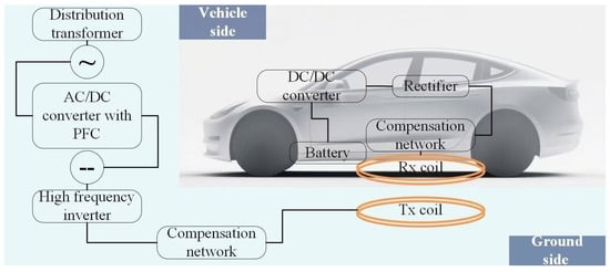 As shown in Figure 2, a typical inductive-coupling-based WEVC system consists of multiple power electronic stages. On the ground side, the system begins with an AC/DC converter with integrated power factor correction (PFC), which rectifies and conditions the grid-side input [29]. This is followed by a high-frequency inverter that generates an alternating current centered around the standardized 85 kHz band [30]. The output is delivered through a compensation network to the transmitting (Tx) coil, which serves as the primary side of the magnetic link [31]. On the vehicle side, the receiving (Rx) coil captures the magnetic flux and transfers the energy through its own compensation network, followed by a high-frequency rectifier and a DC/DC converter that regulates the output for battery charging [32,33]. Together, the Tx and Rx coils form the magnetic coupler—a contactless interface that enables efficient energy transfer between the ground and vehicle.