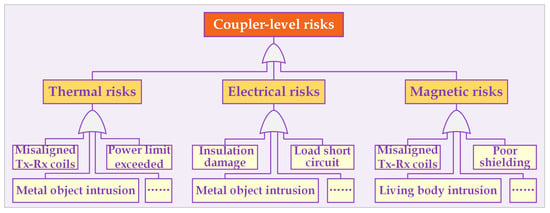 However, as system power increases, so too does the intensity of the alternating magnetic field required to sustain efficient energy transfer, which significantly amplifies the risks associated with the magnetic coupler. These risks manifest across multiple physical domains. Electrically, higher voltages and currents raise the likelihood of insulation breakdown, partial discharge, and component overstress, particularly within the compensation networks and rectification stages [77,78,79]. Thermally, increased power transfer leads to greater losses in coils, ferrite materials, and surrounding conductors, intensifying local heating and challenging thermal management strategies [80,81,82]. Magnetically, stronger fields exacerbate leakage flux, increase the coupling sensitivity to misalignment, and elevate the risk of unintended interactions with nearby objects and materials [83,84,85].