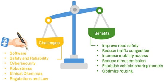 The tradeoff of benefits and challenges in the development and deployment of AVs. This article focuses on the primary challenges that currently hinder the widespread deployment of AVs. The hand with the pen in the image symbolizes that stakeholders from all pertinent fields are working on overcoming these challenges.