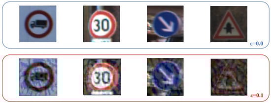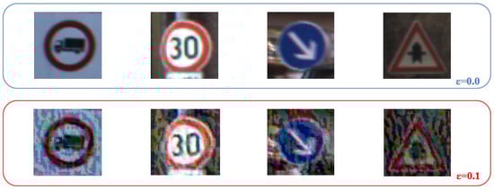 In this research, our focus is on two common types of white-box adversarial attacks, FGSM and PGD. Figure 3 illustrates how different values of ε visually affect traffic signs under FGSM attacks, highlighting the increasing impact of the disturbance on sign legibility. Similarly, Figure 4 shows the effects of PGD attacks, where a progressive degradation of the image is observed as the value of ε increases, demonstrating the greater capacity of this method to induce classification errors.