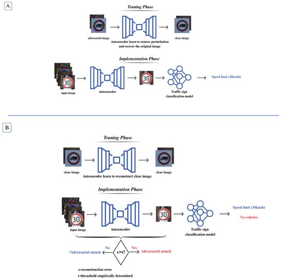 Autoencoder-based defense approaches against adversarial attacks in traffic sign classification. (A) Detection of adverse attacks by training a self-chire to rebuild only clean (non-adverse) data. (B) Elimination of disturbances and original image recovery, acting as a preprocessing defense.