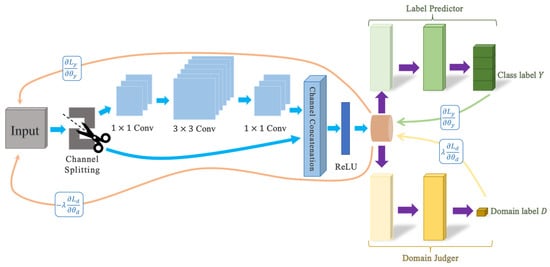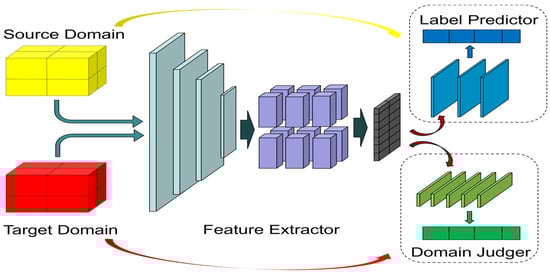 The domain-adversarial neural network (DANN) architecture comprises three key components: a feature extraction module, a label prediction module, and a domain classification module, as illustrated below. The feature extractor forwards its output to the domain classifier, whose role is to distinguish whether the input originates from the source or target domain while computing the associated domain loss. During training, the model simultaneously optimizes two objectives. Firstly, minimizing the label predictor’s classification error on annotated source-domain samples to maintain discriminative performance. Secondly, reducing the domain classifier’s loss across both source and target domains to promote feature alignment. This adversarial training mechanism effectively diminishes the distributional divergence between domains, thereby enhancing the model’s generalizability on target-domain data [37]. Successful domain adaptation is achieved when the domain classifier can no longer reliably differentiate between the two domains, indicating that the learned representations are domain-invariant [38]. As shown in Figure 6.