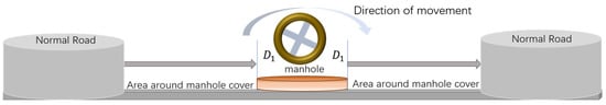 Therefore, a numerical analysis method was chosen for this study to establish a three-dimensional vehicle–joint–inspection cover system theoretical model at the uneven ground connection. In this study, to simplify the calculations, the focus was placed on the affected load, and the model of a heavy-duty truck was significantly simplified. Relevant studies have shown that a 1/2 truck model is feasible for analyzing impact loads. As a result, a 1/2 truck model was established, and the situation of a vehicle passing over the inspection cover was simplified [27,31,32,33]. As shown in Figure 2, this process can be divided into four stages: entering the area of the surrounding fixtures of the inspection cover from the normal road surface → the region of the inspection cover → the road surface around the inspection cover → the normal road surface.