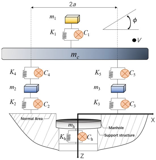In the dynamic modeling of this paper, the focus of the study is the impact of the manhole cover surface caused by the height difference of the road surface. Therefore, the settlement of the manhole cover and the surrounding road surface is simplified to the unbalanced excitation of “D1”, and it is assumed that the road surface around the manhole cover is flat and does not change during the simulation. At the same time, it is assumed that the polarization excitation of the cover surface only fluctuates slightly in the vertical axis; that is, the possible rotational dynamic behavior is ignored here. At the same time, due to the particularity of the mechanical structure of the manhole cover, the manhole cover is simplified as a rigid disk, and the appropriate shock-absorbing properties are selected according to the carbon–iron alloy ductile iron material of the manhole cover. The relative friction between the cover surface and the tire and the offset of the impact direction and point are not considered in the simulation process. Now, a six-degree-of-freedom truck load vibration model is established [34,35,36], as shown in Figure 3. The parameter symbols and their meanings are listed in Table 1. When the truck passes over the joint and the inspection cover area, the height difference, as well as the deformation and vibration of the inspection cover, will have a significant impact on the truck’s vibration. The impact generated during this process is the focus of this study, and its peak value is of great importance.