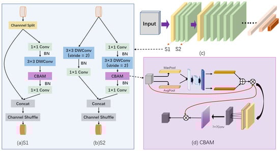 The ShuffleNet V2 network structure used in this paper and the corresponding CBAM attention mechanism model diagram. (a) The basic unit S1 in the ShuffleNet V2 structure. (b) The downsampling unit S2 in ShuffleNet V2. (c) The sequential arrangement of S1 and S2 in the overall model. (d) The operation of the CBAM in the network.