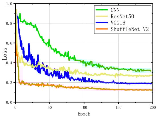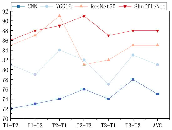 In this section, the experimental benchmark algorithms are divided into two categories: one is to replace the ShuffleNet V2 network with other baseline networks by replacing the backbone network and verify it on the target dataset at the same time. In the other, the DANN model of this paper is compared with the baseline model using the migration network on the CWRU dataset at the same time.
