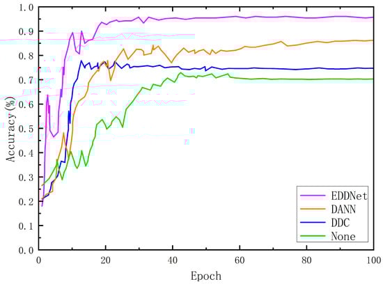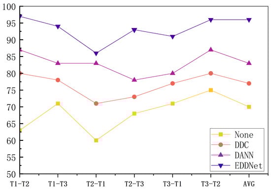 Figure 9 presents the experimental evaluation of cross-domain bearing fault diagnosis across six distinct operational scenarios. We use data from two working modes to evaluate the accuracy of the domain adaptation algorithm. In this comparison, the detection situation from T1 to T2 means that the model is trained on the data of the first working mode (source domain), the migration network is optimized, and the optimization is fine-tuned in the dataset of the second working mode (target domain). Finally, the accuracy classification is judged by using part of the dataset divided for testing in the target domain. In the figure, the vertical axis represents the average accuracy. At the same time, the comparison of multi-target domain data detection tasks can directly prove the improvement of the model discussed in this paper compared with other methods. The iteration curves of each model used in the experiment are shown in Figure 10.