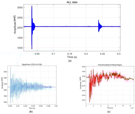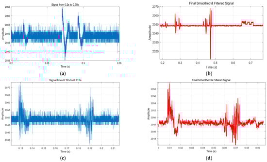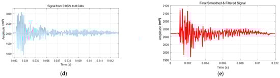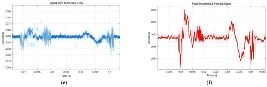 During data collection, the sensors were mounted beneath the center of standard inspection covers in utility tunnels, precisely at the geometric center of the circular cover. By simulating real-world scenarios such as pedestrian passage, pedestrian stepping, and vehicle traversal, we obtained a dataset comprising 104,878 sample points. Some micro sensors will be disturbed by the on-site electromagnetic environment and the vibration signals of surrounding facilities during the data collection stage. Therefore, this article performs corresponding data cleaning and preprocessing on this part of the collected data. In this part, in order to suppress the interference of high-frequency noise on the vibration signal, this article uses a Butterworth-type low-pass filter to process the original data. The Butterworth filter is widely used in vibration and structural signal analysis because of its extremely flat magnitude response (maximally flat magnitude response) in the passband. It is suitable for retaining low-frequency effective signals while filtering out high-frequency noise components. In use, the parameters of the filter are set after the time domain and frequency domain of the collected signal are studied. The cutoff frequency of the filter is set to 10 kHz. Since the signal power of the abnormal state signal is significantly attenuated in the frequency range above 15 kHz, the noise accounts for a high proportion, and the actual effective signal is mainly concentrated in the range of 8–10 kHz. In order to avoid phase distortion during the filtering process, this paper adopts a two-way zero-phase filtering method; that is, the signal is filtered twice in the forward and reverse directions through the filtfilt function to ensure that the phase of the signal remains unchanged after filtering. In this study, the low-pass filter adopts a fourth-order design, and its order makes a trade-off between ensuring the steepness of the frequency response and the stability of the system. At the same time, in order to more intuitively see the impact of changes on the waveform and perform simple preprocessing, further improve the stability of the signal, and reduce the influence of local fluctuations on feature extraction and visualization results, this paper applies sliding average smoothing to the filtered signal. The sliding average method is a non-parametric smoothing method. Its core idea is to average the signal amplitude in a time window of fixed length, thereby suppressing rapid fluctuations on a short time scale. The sliding window length selected in this paper is 10 points (corresponding to a time span of about 210 μs), which is mainly used to weaken the residual high-frequency disturbances while retaining the main trends and local extreme value characteristics of the original signal as much as possible. Compared with other smoothing methods such as Gaussian filters or Savitzky–Golay filters, the sliding average method has the advantages of simple implementation and high computational efficiency. This method is an extremely low-order FIR filter whose impulse response is a rectangular window of fixed width, which is suitable for smoothing and suppressing the non-periodic noise studied in this paper. This paper establishes a filtering and smoothing program in MATLAB R2021a to preliminarily process the collected data and display some representative signals of various abnormal states. Sample oscillation plots for certain events are shown in Figure 14 and Figure 15, where characteristic peaks have been analyzed and labeled.