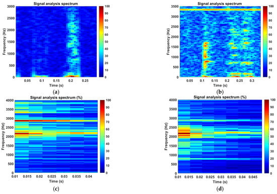 Meanwhile, we performed a Fourier transform on the feature signal segments, marked the characteristic frequency bands of the abnormal signals, and displayed the data in a time–frequency diagram, as shown in Figure 16.