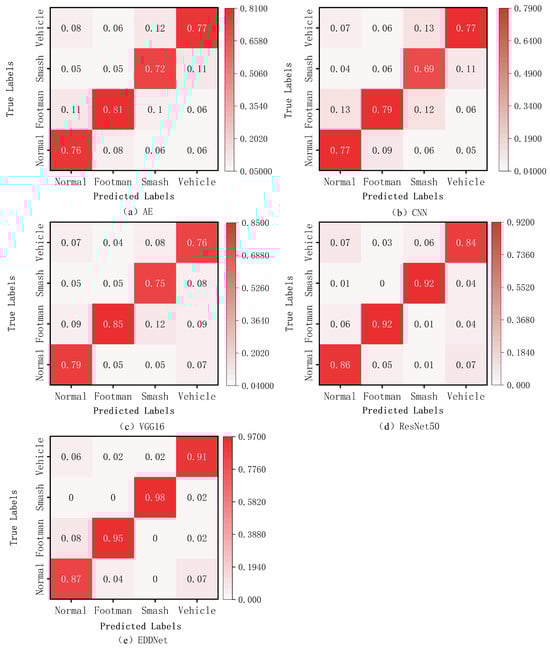 We utilized the collected and labeled dataset to train and test the proposed EDDNet model along with various mainstream classification models to evaluate classification performance. Analysis of the confusion matrix indicates that in non-anomalous event classification, there is little difference in classification accuracy among various models. For events with strong vibration signals, such as vehicle traversal, all models demonstrated relatively high classification accuracy. However, EDDNet outperformed other models in classifying these events, achieving the highest accuracy of 88.23%. Through data analysis, the thermal chaos matrix was obtained, further proving the superiority of the validated model, as shown in Figure 17.
