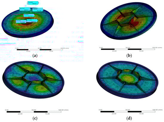 Inspection cover modal vibration diagram. (a) First-order analysis. (b) Third-order analysis. (c) Sixth-order analysis. (d) Eighth-order analysis.
