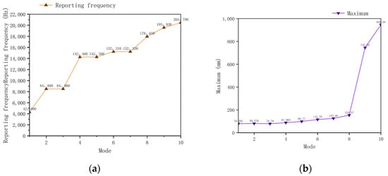 First, a modal analysis was conducted on a standard inspection cover under no-load conditions to determine its natural frequency characteristics. In this analysis, no defects occurred in the inspection cover structure, and analytical data were obtained through a 10th-order calculation process. Extensive experimental data and results fully demonstrate that the structural vibration peak occurs at 20,479 Hz, with a maximum displacement of 946.58 mm. Additionally, the results from modal analysis indicate that under 10th-order frequency vibrations, the inspection cover structure undergoes significant deformation, reaching the threshold of structural tolerance. A large amount of field observation data also confirms that the impact amplitude cannot cause the natural frequency of the inspection cover to exceed this value. The modal analysis data are shown in Figure 18 and Figure 19.