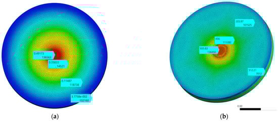 Stress contour diagram. (a) Modal vibration frequency values; (b) maximum values.