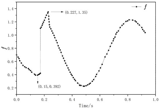 After performing the computational analysis in MATLAB R2021a, we obtained the time-series curve of the impact load coefficient ””. As shown in Figure 21, the impact load coefficient exhibits a significant mutation under the excitation caused by the height difference between the road surface and the inspection cover. The curve clearly demonstrates two distinct transition phases.
