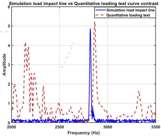 Accordingly, this paper compares and analyzes the impact waveform obtained by the six-degree-of-freedom vehicle vibration model in the simulation experiment with the experimental data conducted in a real scene. In the experiment conducted on site, the relevant data of the vehicle are the same as that in the model, and the speed of the vehicle is controlled by the same variables as those used in the simulation. The comparison results are shown in Figure 22. By comparing the spectra of the waveforms obtained from the two experiments, it is found that both have significant impact spectrum characteristics. In the abnormal state of the vehicle passing through the height of the manhole cover, there is a significant impact main frequency in the signal characteristics. At the same time, it is found that the frequency band of the impact main frequency is the same, the frequency value peak occurs in the range of 2000–3000 Hz, and the peak value is also similar. Additionally, the impact data closely match the peak values of the real-world vibration signals collected on site, further validating the authenticity of the dataset used in this study.
