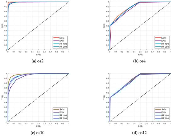 Regarding the machine learning models implementation, in image classification, the bag of features (BoF) selection approach was applied. It means that the model used 70% of the strongest features for classification to improve the quality of the visual vocabulary and reduce the influence of noise. The strongest features contain the most informative parts of the image, such as edges or textures. The weakest features (30%) that may represent noise or unimportant details were eliminated and rejected. Overfitting was reduced by using this BoF approach. In the SVM model, the Gaussian (radial base function—RBF) kernel was chosen for its flexibility and robustness in nonlinear classification problems. This kernel exhibits resistance to noise and is less sensitive to isolated outliers than polynomial kernels, which is crucial in real-world GNSS environments. RBF implicitly handles local variations in signal power, critical for spoofing detection with small dB advantages (e.g., 0.4 dB in os4). In the KNN model, the number of neighbors was set to 5, and we used the Euclidean distance, as these values showed the best model performance. The number of trees was set to 100 and 200 in order to see how the model performed when that number was increased. Also, the built-in validation method, Out-Of-Bag (OOB) prediction, was used in random forests for evaluating the model. Each tree was trained on a random bootstrap sample, and OOB samples were left out and then used for the model evaluation, providing an internal estimate of performance without the need for a separate test dataset. When using more than 200 trees, the performance stabilized with negligible improvements in accuracy. Only the execution time and computational complexity increased with the increase in the number of trees. The model achieved stable and reliable results with 100–200 trees, and adding more trees did not significantly improve accuracy or other metrics. In order to prevent the model overfitting, k-fold cross-validation was applied to all machine learning models. The dataset was divided into k folds, in this research K was 5, and used to assess the model’s ability as new data became available. With this value of K, 80% of the data were used for training, and 20% were used for testing. Since machine learning models used in this research were supervised, data were divided into folders based on the class they belonged to. Folders “real” and “spoofed” denoted the labels and output types used for classification. The predicted variable was the class of the signal (type of the signal): real or spoofed. The class distribution was evenly balanced in each 5-fold cross-validation step because the number of samples per class was equal.