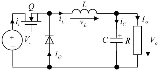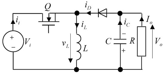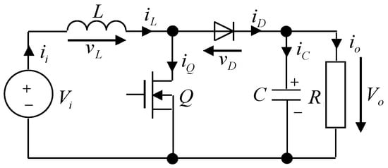 The boost and buck–boost converters that were simulated and experimentally tested had the same characteristic values as the buck converter except that their load resistance was , corresponding to a power of 20 W, as presented in Table 5.