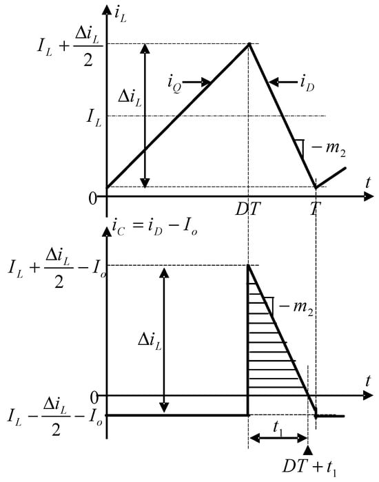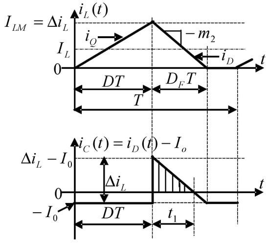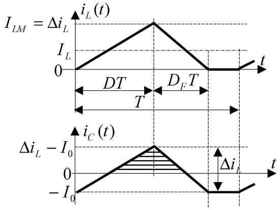 When operating in DCM, the waveforms of the currents through the inductor and through the capacitor are shown in Figure 5, and the following relations [1,2,3] can be written: